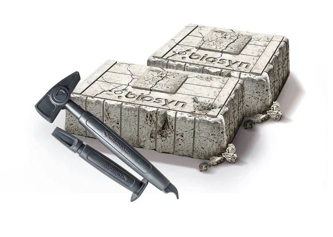 • Komplekte: 2 gipso blokai, plaktukas, kaltas, dinozaurų skeletų dalys