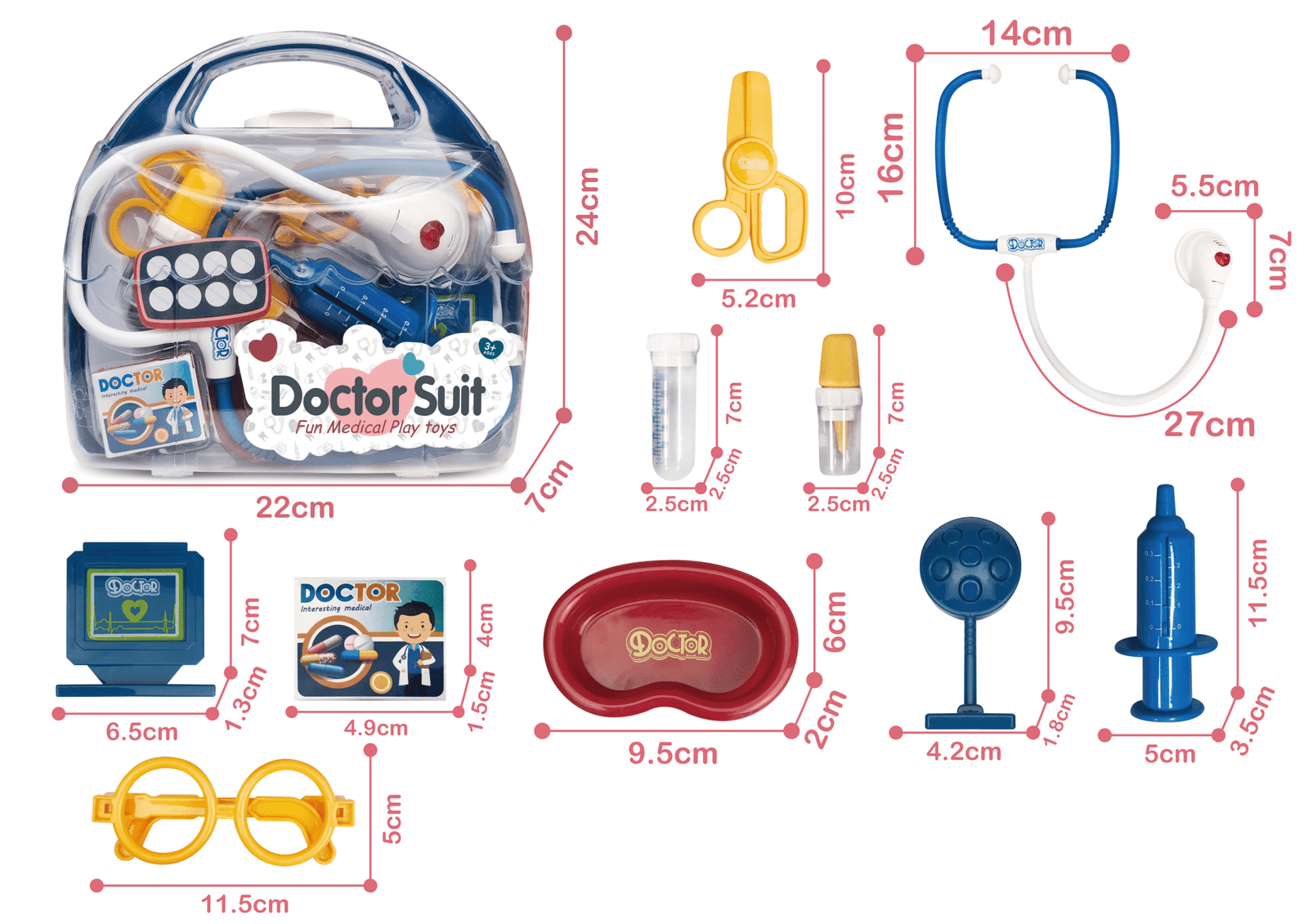 Ārsta komplekts koferī ir kompakts rotaļu komplekts mazajiem ārstiem. Caurspīdīgajā čemodānā ērti ietilpst visi 10 medicīniskie piederumi, savukārt nelielais svars un rokturis ļauj to ērti pārnēsāt jebkurā vietā. Komplektā ietilpst stetoskops, šļirce, šķēres, zāļu pudelītes, termometrs un tematiski aksesuāri, kas palīdz bērniem veidot medicīniskus stāstus un attīstīt empātiju un sociālās prasmes.