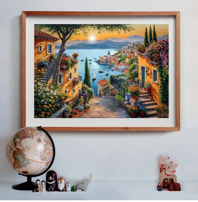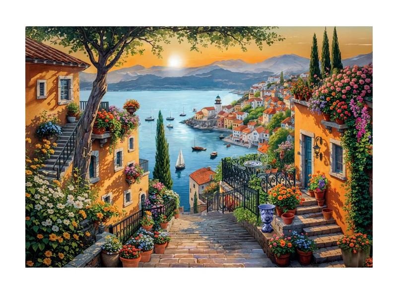 Tai detalus, švelnių atspalvių ir gilaus perspektyvinio vaizdo kupinas peizažas — malonus tiek žiūrėti, tiek dėlioti. Surinkta dėlionė taps įspūdingu dekoru, primenančiu Viduržemio jūros miestelių grožį ir ramybę.