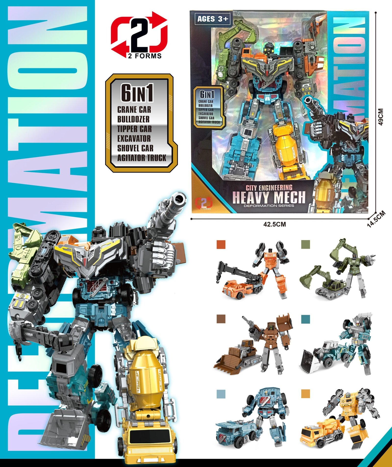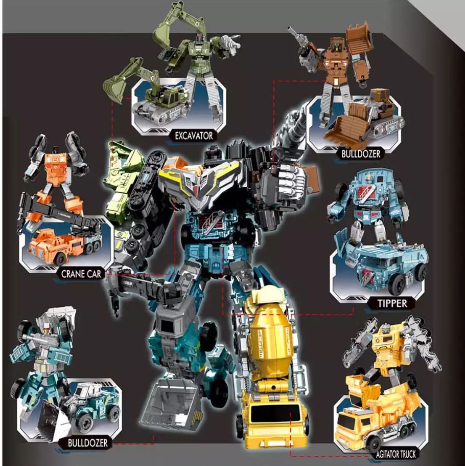 Didelis 6 viename transformuojamas robotas, sudedamas iš šešių atskirų statybinės technikos transporto priemonių. Vaikas gali žaisti su kiekvienu transformeriu atskirai arba sujungti juos į įspūdingą didelį robotą su ginklu ir judančiomis detalėmis.